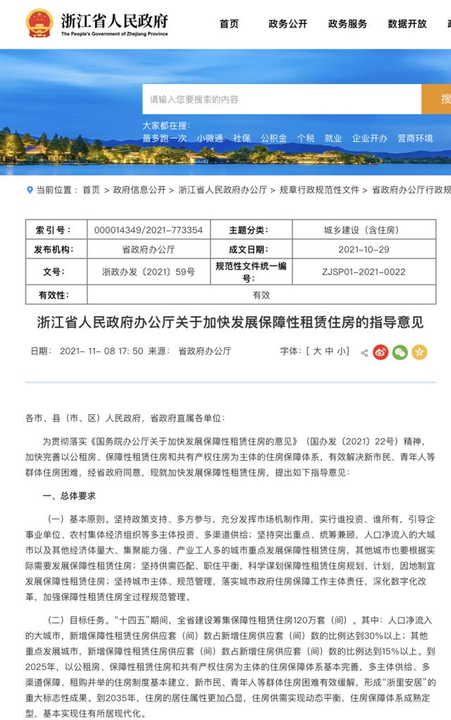 11月8日,《浙江省人民政府辦公廳關于加快發展保障性租賃住房的指導意見》,在省政府網站公開。“十四五”期間,浙江要建設籌集保障性租賃住房120萬套(間)。