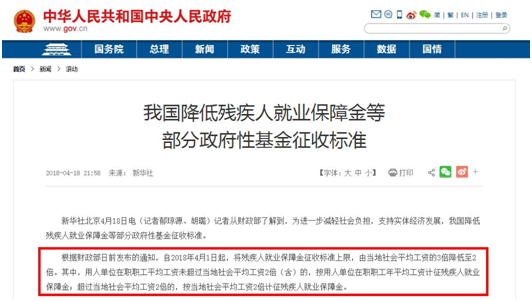 自2018年4月1日起,殘保金征收標準上限有所下調。