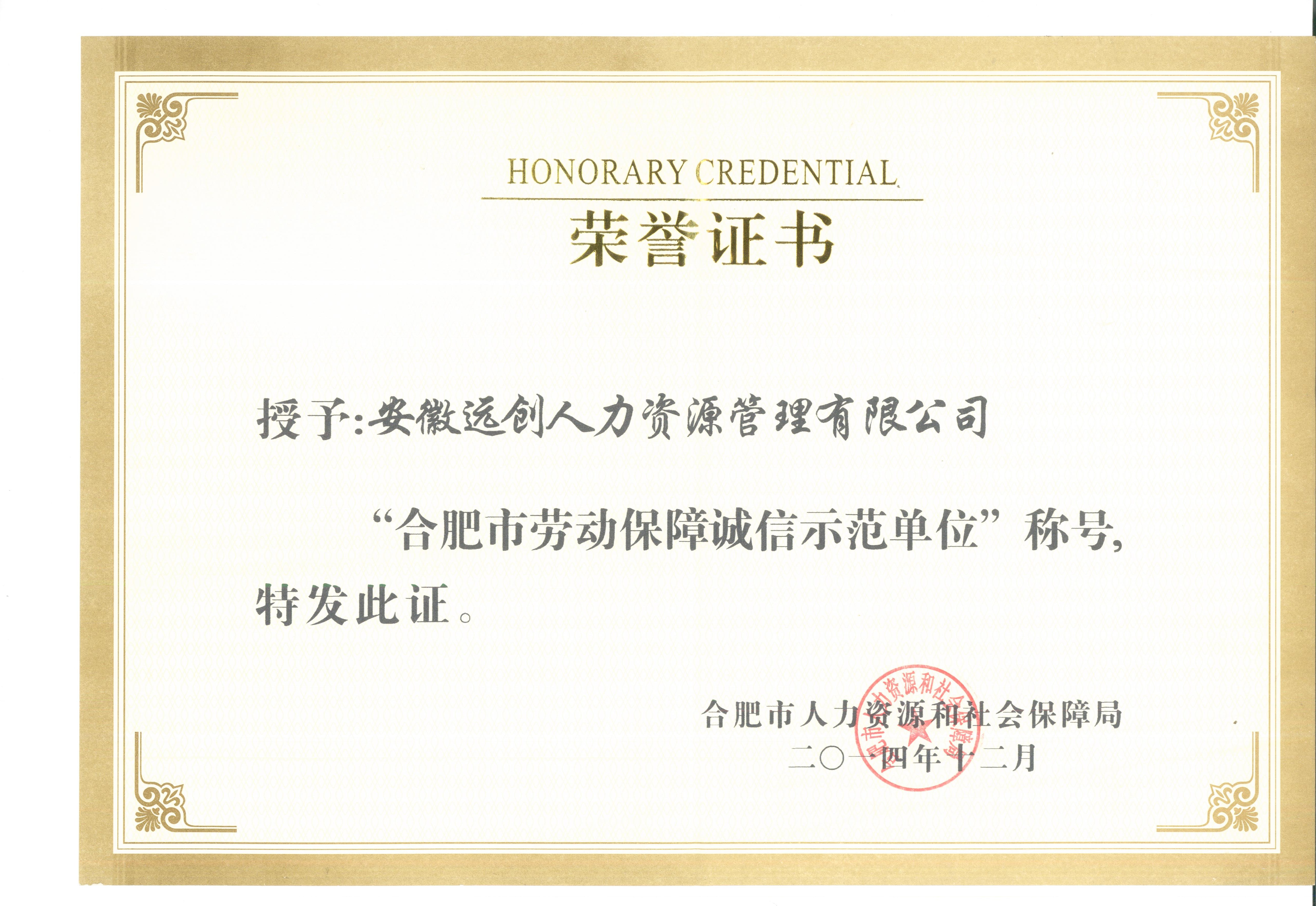 經合肥市人力資源和社會保障局審查評定,遠創人力連鎖榮獲2014年度“合肥市勞動保障誠信示范單位”榮譽稱號。遠創人力連鎖是