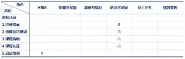 假設我們今年的工作重點是產品開發,那么該如何進行職能界定呢?如表2所示(其中R主負責,JR共同負責)。