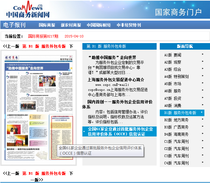 通過首批通過OCCE信息認證的企業已在4月10日的《國際商報》(中、英文版)上刊登(http://epaper.comnews.cn/read-1951-41120.html),并在4月12日由中國服務貿易協會主辦的第五屆中國服務外包產業與人才培養峰會上向全國發布。