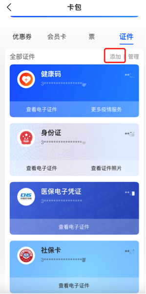 市民可通過支付寶搜索“醫保”或者APP首頁右上角“卡包”進入,選擇“證件”,可添加十幾項個人常用證件,包含醫保電子憑證、身份證、社保卡、駕駛證等,隨時管理使用,解決某些場景下忘帶實體卡的燃眉之急。