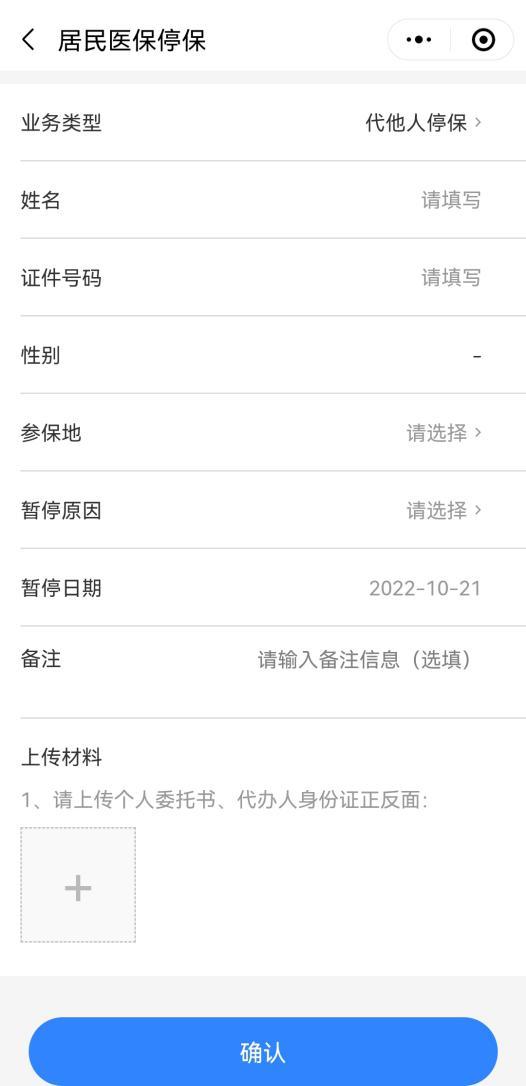 業務類型選擇“代他人停保”,按頁面要求填寫申辦醫保停保業務所需信息并上傳個人委托書(未成年人提供戶口簿)、代辦人身份證正反面,完成后點擊“確認”。變更結果信息可在前端頁面展示或通過“居民醫保停保”查詢業務辦理結果。