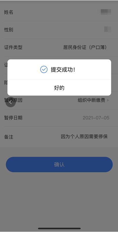 業務類型選擇“自己停保”,按頁面要求填寫申辦醫保停保業務所需信息,完成后點擊“確認”,系統顯示“提交成功”。