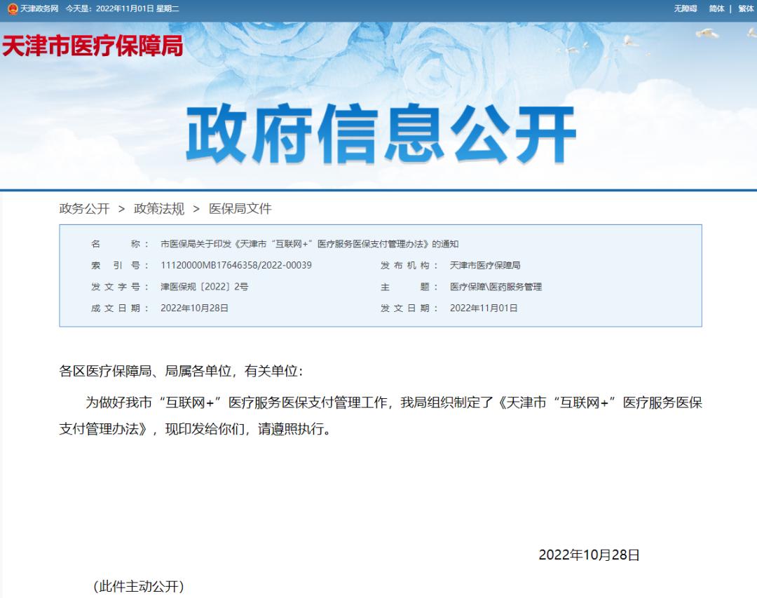 近日,天津市醫療保障局發布“關于印發《天津市“互聯網+”醫療服務醫保支付管理辦法》的通知”。