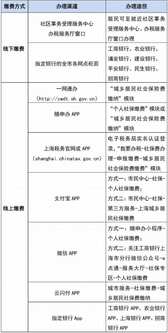 隨申辦APP-“個人社保繳費”模塊或“城鄉居民社會保險費繳納”模塊。