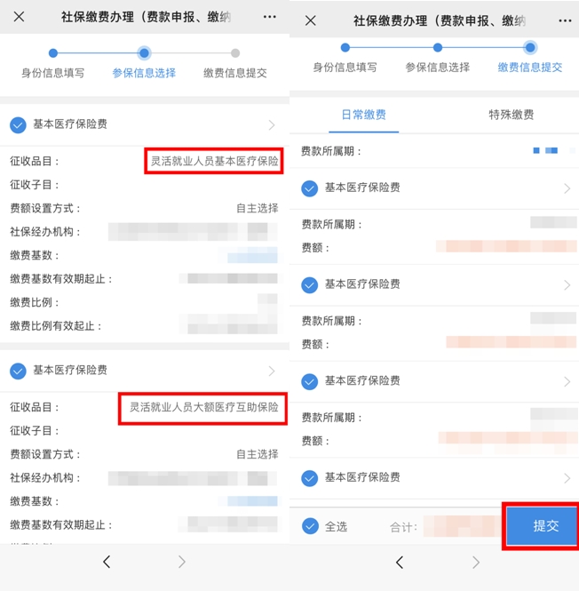 第三步:勾選【靈活就業人員基本醫療保險】和【靈活就業人員大額醫療互助保險】后,點擊【下一步】,確認繳費金額,點擊【提交】,進行繳費即可。