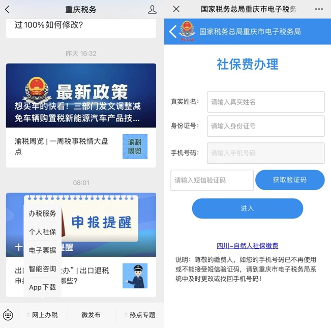 第一步,打開“重慶稅務”微信公眾號,點擊頁面底部【網上辦稅】-【個人社保】,依次輸入姓名、身份證號、手機號碼、驗證碼等信息后,進入“社保費辦理”頁面。