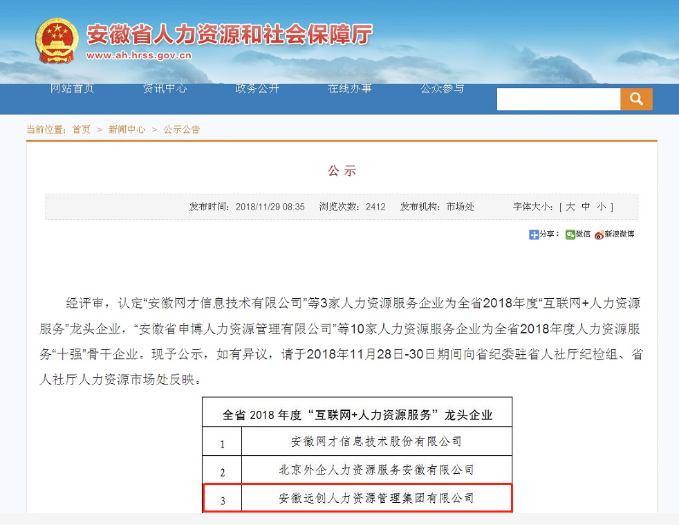 近日,安徽省人力資源和社會保障廳對外正式發布通報,確定3家人力資源服務企業為全省2018年度“互聯網+人力資源服務”龍頭企業,安徽遠創人力資源管理集團有限公司名列其中。