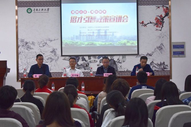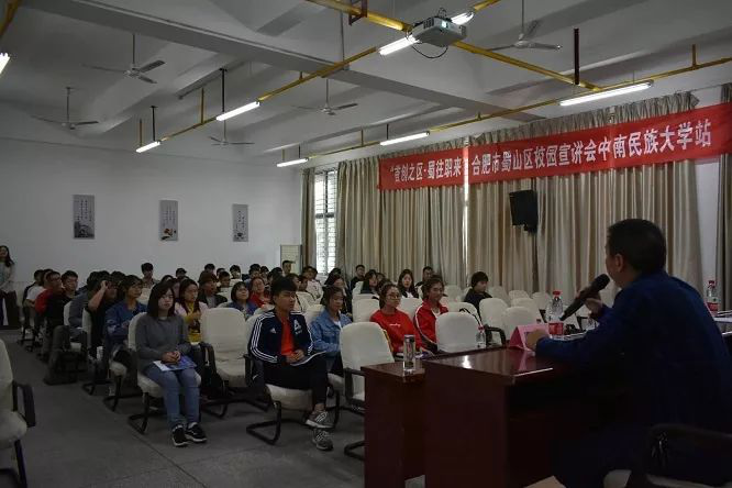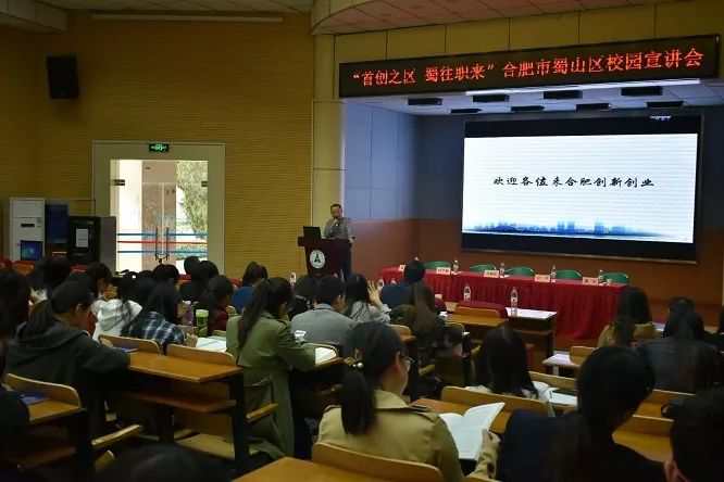 為進一步引導各類人才來肥創新創業,在兩所高校報告廳內,分別安排了一場政策宣講會。市人力資源和社會保障局人才開發處副處長葉學強從歷史文化、產業特色以及“十二五”期間發展等方面介紹了合肥,并重點解讀了合肥市最新出臺的人才新政;區人力資源和社會保障局黨委書記、局長谷和亮則聯系自身求學、走上工作崗位的經歷和高校學子憶往昔、談初心,并從交通、經濟、科教、生態、政策等多角度介紹合肥市蜀山區區情。最后,谷和亮向同學們發出了邀請:“合肥是廣大青年人創業創新的寶地,是培養人才、涵養的地方,希望對合肥感興趣的同學們到合肥來,到蜀山來就業創業”。