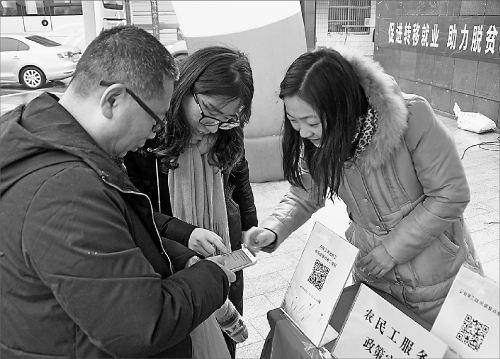 安徽省銅陵市人社局多渠道收集崗位信息,組織缺工企業送崗下鄉,為有就業創業意愿的農村勞動力和農村建檔立卡貧困勞動者及返鄉務工人員提供面對面就業服務。圖為近日在銅陵市老洲鎮舉辦的送崗下鄉招聘會上,工作人員引導返鄉務工人員填寫外出務工情況調查問卷。